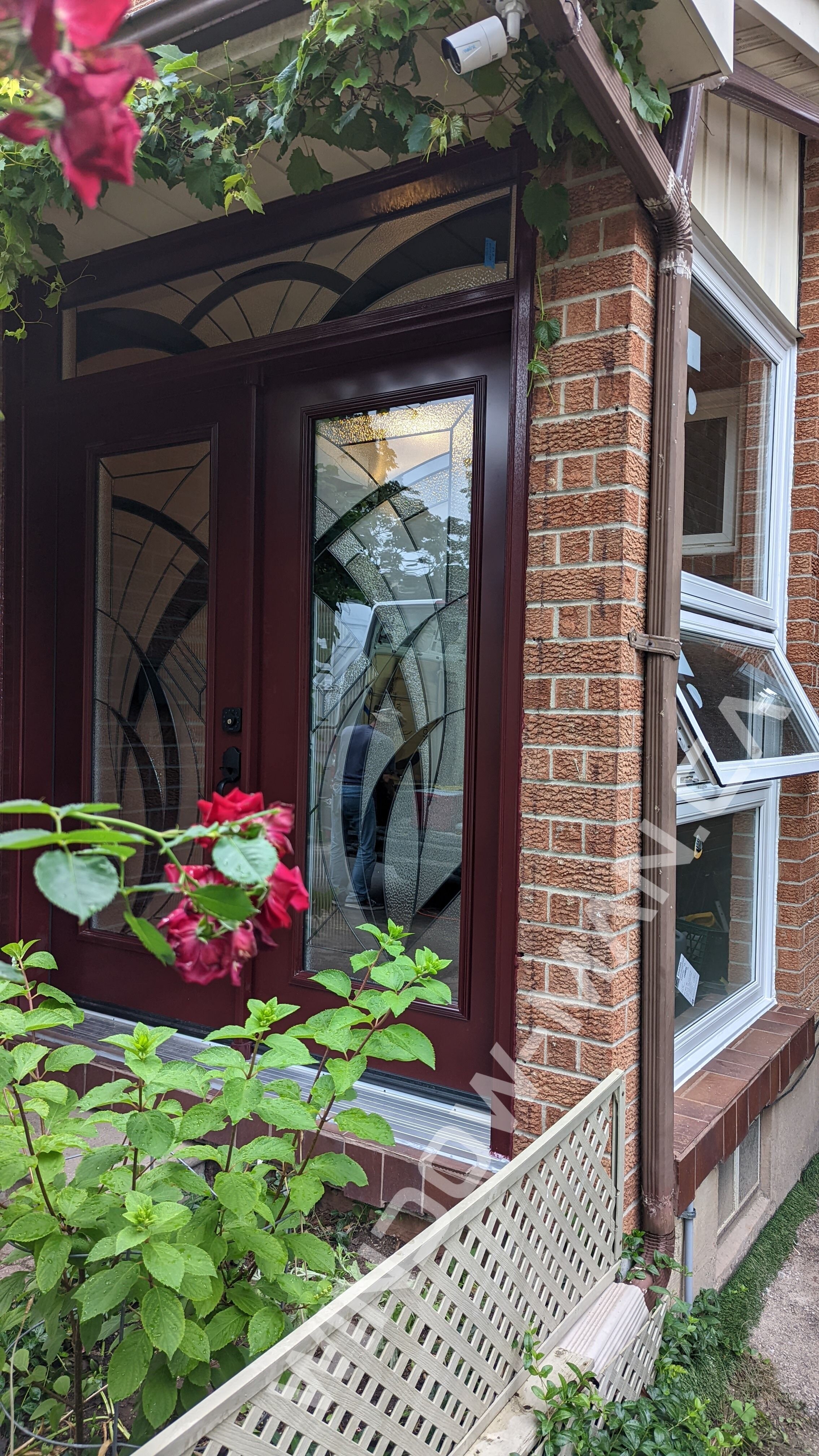 This double steel red doors system in Burgundy makes a grand and colorful statement. It features San Diego Full Stained Glass inserts, each measuring 22x64, creating a stunning visual impact. With a large frame size of 74.00x94.00, a left-hand hinge, and a black key lock, this door offers both beauty and security. Durable steel door is energy-efficient. Also has porch design, creating a unique combination.